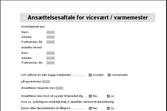 Dokumentet er en ansættelsesaftale for vicevært med specifikation af ansættelsesforholdet, herunder løn, opsigelse, pligter mv. Hvis viceværten også fungerer som varmemester, kan det specificeres i aftalen. Hvis der stilles tjenestebolig til rådighed, indeholder aftalen et bilag, der fastlægger de nærmere retningslinier. Et sidste bilag indeholder en opregning af viceværtens pligter. Aftalen giver samtidig mulighed for, at der ansættes en gårdfejer, som kan varetage en del af viceværtens pligter.