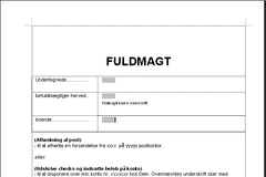 En fuldmagt giver en navngiven persons ret til at handle på fuldmagtsgiverens vegne under nærmere specificerede omstændigheder. Formularen indeholder hhv. bemyndigelse til afhentning af post, til at udskrive checks og indsætte beløb på konto, til at underskrive per prokura, til at møde og afgive stemme på generalforsamling, advokatfuldmagt samt endelig generalfuldmagt.