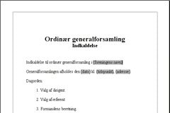 Minimumsindholdet af en indkaldelse til ordinær generalforsamling i en forening er ofte defineret i vedtægterne og vil eksempelvis kunne se ud som i nærværende dokument, der indeholder mødeindkaldelse med standarddagsorden.
