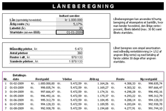Lånet beregnes som simpel amortisation med månedlig rentetilskrivning (= 1/12 af angiven årlig rente) og med betaling af første ydelse 30 dage efter angiven startdato. Dokumentet er på op til 7 A4-sider i Excel 2000/2003-format og fungerer som blanket med udfyldefelter.