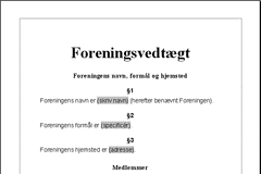 Formularen kan anvendes som inspirationsgrundlag, når man danner en ny forening, eller hvis man overvejer at ændre vedtægterne for en bestående. Hovedafsnittene omfatter foreningens navn, formål og hjemsted, medlemmers rettigheder og pligter, kontingent, bestyrelsen, ordinær generalforsamling, ekstraordinær generalforsamling, regnskab og formue, tegning og hæftelse, stridigheder, eksklusion, vedtægtsændringer og opløsning.