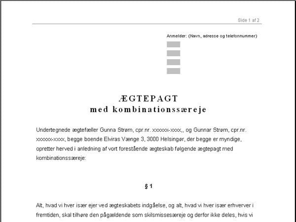 Ægtepagt med kombinationssæreje med engelsk oversættelse