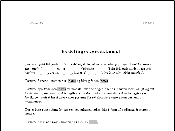 Formular til indgåelse af aftale om deling af boet mellem ægtefæller ved separation/ skilsmisse.