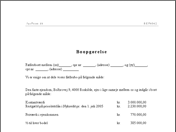 Formular til opgørelse af fællesboet ved skilsmisse eller separation. Boopgørelsen specificerer ægtefællernes respektive bodele på henholdsvis aktiver og passiver og vedlægges som bilag til bodelingsoverenskomst (BKF4061). Eksemplet omfatter både fast ejendom (bopælen, som hustruen overtager, samt sommerhus) inklusive restgæld og fælles bankkonti m.v.