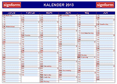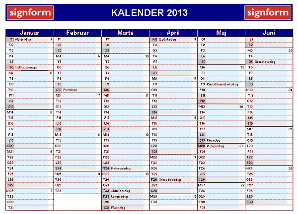 Enkel og overskuelig årskalender i Excel-format for hele kalenderåret 2013. Kalenderen er forsynet med helligdage og de mest almindelige mærkedage. Det er muligt ved den enkelte ugedag at indføje egne kommentarer, og dokumentet kan derefter udskrives og anvendes som overblikskalender ved eksempelvis at sætte det op på opslagstavle, køleskab eller lignende.