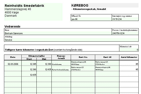 NB: Kørebog PRO for firmabil, med kilometerregnskab (BKV4091) er en mere avanceret udgave af nærværende dokument og indeholder i alt tyve sider.