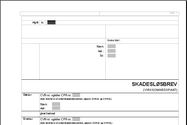 Pantebrev i overensstemmelse med Justitsministeriet pantebrevsformular SKADESLØSBREV VIRKSOMHEDSPANT, ifølge hvilket kreditor til sikkerhed for skadesløs betaling gives panteret i, hvad debitor ejer og fremtidigt erhverver inden for (afkrydses):